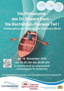 In Ihrem neuen Vortrag geht Fr. Berkl, Heilpraktikerin am Johannisplatz, auf die Philosophie des Dr. Edward Bach und seine Bachblütentherapie ein. Der Vortrag ist offen für alle Interessierten, ohne Anmeldung. Spenden sind willkommen.