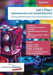 Die Stadtbibliothek lädt zum gemeinsamen Spieleabend ein. In geselliger Runde können unsere neuesten und spaßigsten Spiele getestet und nach Herzenslust gespielt werden. Ob Strategen oder Kartenspielbegeisterte für alle ist etwas dabei.